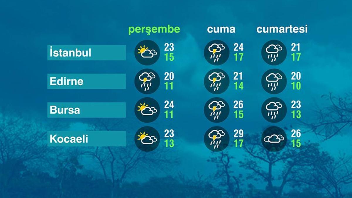 Marmara Bölgesinde parçalı bulutlu bir hava hakim. Edirne dolaylarında sağanak yağışlar da görülüyor. Gündüz sıcaklıkları bölgede 20 ile 25 derece arasında seyrediyor. Cuma günü yağışın bölge geneline yayılması bekleniyor.